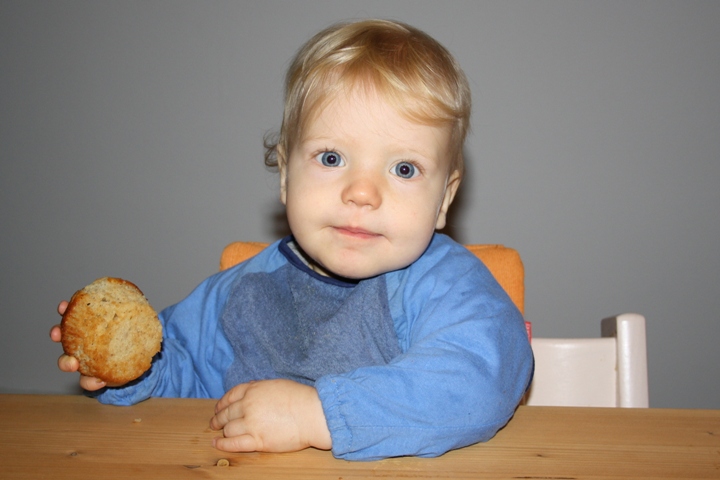 Das bin ich morgens an meinem 1. Geburtstag mit meinem Geburtstagsmuffin. Gleich gehe ich zu meiner Tagesmutter Yvonne, wo es mir sehr gut gefällt.
